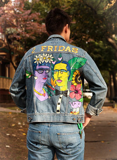 2 fridas jacket screen printing ink, patch and buttons on a sport jacket men's medium